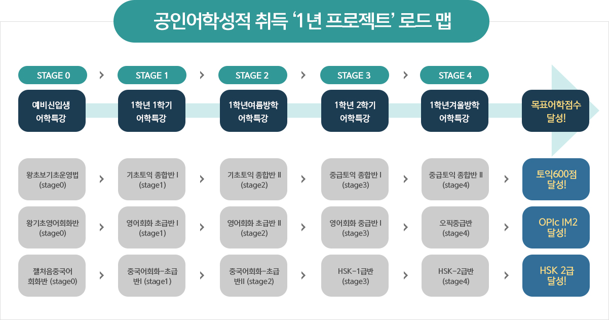 | 영어입문 | 영어 선행학습이 다소 미진한 학생들을 위한 특별 관리 프로그램으로, 토익 및 영어회화 등 성공적인 향후 학습을 위한 기반을 확실히 다져줍니다. |