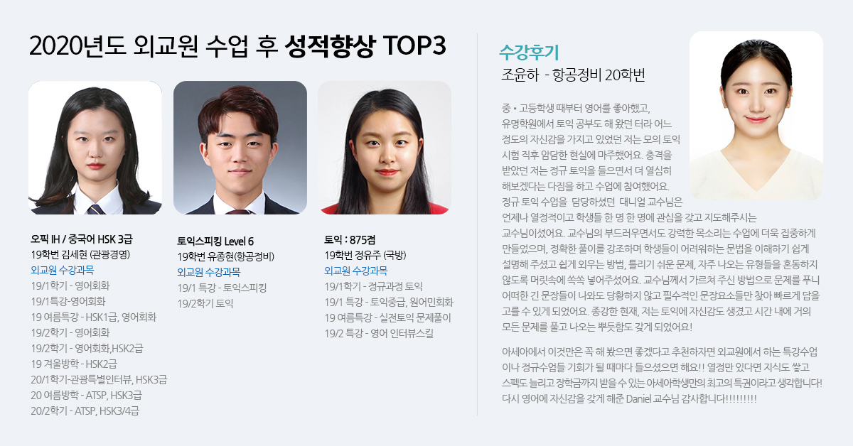 20학번 차재준 (항공보안)저는 외국어 수업을 듣는 것에 대하여 아무런 기대가 없었고 영어는 어렵기만 해서 별 흥미도 없었습니다. 하지만 아세아 영어 첫 수업을 듣고 나서 계속해서 다음 수업에는 우리를 어떻게 이해를 시켜 줄까? 그리고 영어에는 어떤 또 다른 매력이 있을까? 라는 기대를 하게 되었습니다. 영어 문법을 할 때 단순히 암기만을 하는 것이 아니라 문법이 왜 어떻게 쓰였는지 그 원리는 무엇인지를 우리가 흔히 자주 사용하는 예시문을 통해 설명을 잘 해주셔서 처음 영어를 배우는 사람들도 쉽게 이해를 할 수 있도록 해주시며, 또한 예외의 상황들도 자세히 설명을 잘 해주셔서 “아!!! 이래서 이런 거구나”라고 이해하는 게 더 많아 배우는 데 있어서 지루하지 않았습니다. 무엇보다도 영어 교수님께서는 우리가 모르는 것이 있거나 영어를 배우고자 하는 사람들에게 있어서는 아낌없이 주는 나무처럼 누구보다도 정성스럽게 알려주시고 영어 공부를 하는 데 있어서 정말 많은 도움을 받을 수 있습니다. 저는 이러한 점들을 통해 영어에 대하여 많은 흥미와 관심을 가지게 되어 실력도 많이 향상되었을 뿐만 아니라 교수님의 공부 조언을 토대로 자기 주도적 학습을 할 수 있게 되어 정말 좋았습니다. |