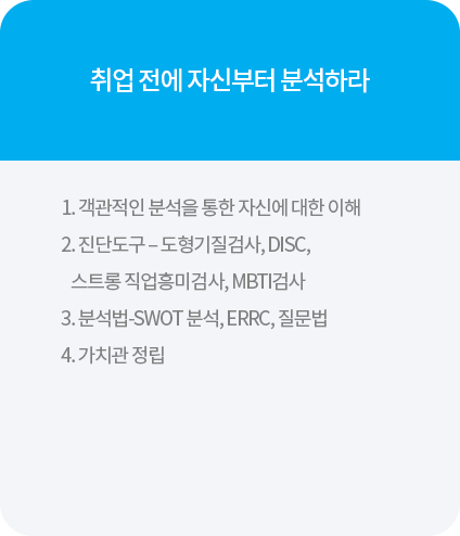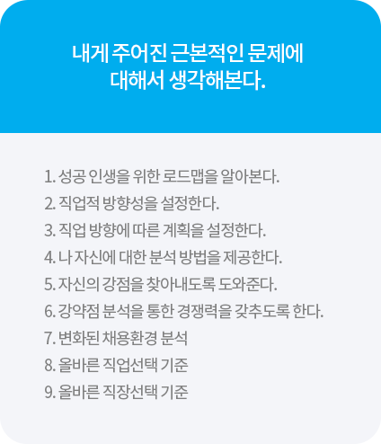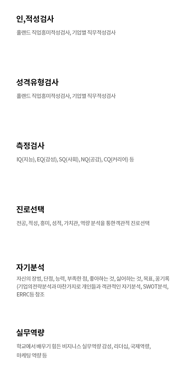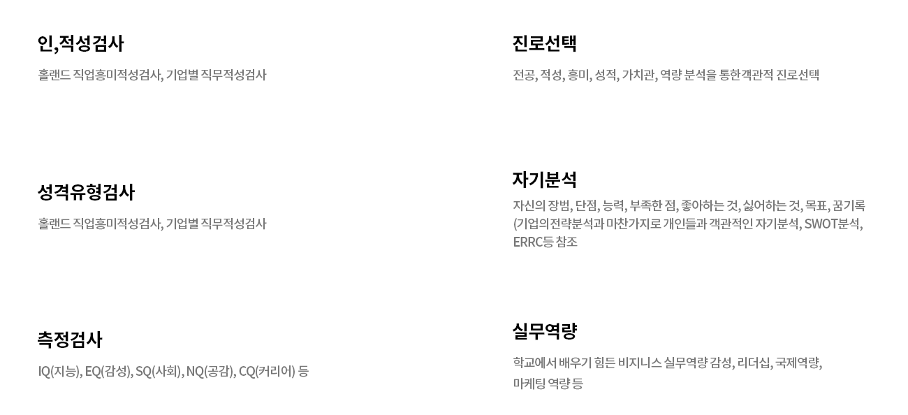 | Áø·ÎÄÚĪ | John L.HollandÀÇ À̷п¡ ±Ù°ÅÇÏ¿© Á¦ÀÛµÈ °Ë»ç·Î¼ 6°³ÀÇ Á÷¾÷Àû ¼º°ÝÀ¯Çü Áï ½ÇÀçÇü(R), ޱ¸Çü(I), ¿¹¼úÇü(A), »çȸÇü(S), ±â¾÷Çü(E), °ü½ÀÇü(C)À» ÃøÁ¤ÇÕ´Ï´Ù. RIASECÀÇ Áø·Î À¯ÇüÀ» ã°í ±× À¯Çü¿¡ ¾Ë¸ÂÀº Áø·Î¸¦ Á¦½ÃÇØ ÁÝ´Ï´Ù. |