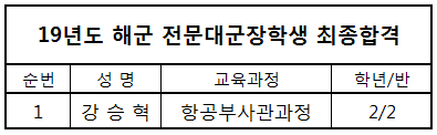 | 2019³â ÇØ±º Àü¹®´ë±ºÀåÇлý(±º°¡»êº¹¹«Áö¿ø±ÝÁö±Þ´ë»ó ºÎ»ç°ü) ÃÖÁ¾ÇÕ°ÝÀÚ ¹ßÇ¥ | |