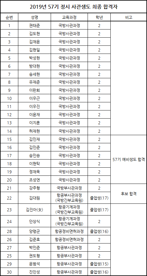 ![]() 2019³â 10¿ù 25ÀÏ(±Ý) À°±º3»ç°üÇб³ 57±â Á¤½Ã »ç°ü»ýµµ ÃÖÁ¾ ÇÕ°ÝÀÚ°¡ ¹ßÇ¥µÇ¾ú½À´Ï´Ù. º»±³´Â ÃÑ 24¸í(Èĺ¸ ÇÕ°Ý 2¸í Æ÷ÇÔ)ÀÌ À°±º3»ç°üÇб³ 57±â Á¤½Ã »ç°ü»ýµµ ÀüÇü¿¡ ÇÕ°ÝÀ» ÇÏ¿´½À´Ï´Ù. º»±³´Â Áö³ÇØ ÇÕ°Ý ¹ßÇ¥°¡ ³ 57±â ¿¹ºñ »ç°ü»ýµµ ¼±¹ßÀüÇü¿¡¼ 6¸íÀÇ ÇÕ°ÝÀÚ¸¦ Æ÷ÇÔÇÏ¿©, ÃÑ 30¸í (Èĺ¸ ÇÕ°Ý 2¸íÆ÷ÇÔ)ÀÇ 57±â »ç°ü»ýµµ¸¦ ¹èÃâÇÏ¿´½À´Ï´Ù. ![]() À°±º3»ç°üÇб³´Â À°±º Àå±³¸¦ ¾ç¼ºÇÏ´Â ±¹³» Ư¼ö´ëÇÐÀ¸·Î 1Çг⠶§ºÎÅÍ Áö¿ø °¡´ÉÇÑ ¿¹ºñ »ç°ü»ýµµ¿Í 2Çг⠶§ºÎÅÍ Áö¿øÀÌ °¡´ÉÇÑ Á¤½Ã »ç°ü»ýµµ ÀüÇüÀ¸·Î ³ª´©¾îÁý´Ï´Ù. ´ÙÀ½Àº ¿ÃÇØ 57±â Á¤½Ã »ç°ü»ýµµ ÀüÇü¿¡ ÃÖÁ¾ ÇÕ°ÝÇÑ ÇлýµéÀÇ ¸í´ÜÀÔ´Ï´Ù. ![]() 57±â Á¤½Ã »ç°ü»ýµµ ÀüÇü¿¡ ÇÕ°ÝÇÑ Çлýµé ¸ðµÎ Áø½ÉÀ¸·Î ÃàÇÏÇÕ´Ï´Ù. ¿ÃÇØ 57±â Á¤½Ã »ç°ü»ýµµ ÀüÇü¿¡ ÇÕ°ÝÇÑ ÇлýµéÀº 2020³â 1¿ù À°±º3»ç°üÇб³¿¡¼ ±âÃʱº»çÈÆ·ÃÀ» ½ÃÀÛÀ¸·Î Çо÷À» À̾°¡¸ç ÀÚ¶û½º·¯¿î ´ëÇѹα¹ À°±º Àå±³ÀÇ ±æÀ» °É¾î°¡°Ô µË´Ï´Ù. ![]() º»±³´Â ¿ÃÇØ 57±â »ç°ü»ýµµ ÀüÇü¿¡¼´Â ÃÑ 30¸íÀÇ ÇÕ°Ý»ýÀ», 58±â ¿¹ºñ »ç°ü»ýµµ ÀüÇü¿¡¼´Â ÃÑ 6¸íÀÇ ÇÕ°Ý»ýÀ» ¹èÃâÇÏ¿© À°±º3»ç°üÇб³ »ç°ü»ýµµ ´Ù¼ö ¹èÃâÀÇ ¸í¿¹¿Í ±àÁö¸¦ À̾°¡°í ÀÖ½À´Ï´Ù. ƯÈ÷, ±Ý³â¿¡´Â 3³â ¿¬¼ÓÀ¸·Î ¿©ÀÚ »ç°ü»ýµµ(Á¤½Ã 1¸í, ¿¹ºñ 1¸í)°¡ ´ç´çÈ÷ ¹èÃâµÇ´Â Å©³ªÅ« Äè°Å¸¦ ´Þ¼ºÇß½À´Ï´Ù. ![]() Á¶±¹, ¸í¿¹, Ãæ¿ëÀÇ ±³ÈÆ ¾Æ·¡ ±º(ÏÚ)°ú »çȸ¸¦ ÁÖµµÇسª°¥ ÁöÈÖÅë¼Ö·Â°ú ¾ßÀü ¿ä±¸´É·ÂÀ» µÎ·ç °®Ãá È£±¹ÀÇ °£¼ºÀ» ¾ç¼ºÇؿ À°±º3»ç°üÇб³¸¦ ÅëÇØ À°±º Àå±³ÀÇ ±æÀ» °É¾î ³ª°¥ º»±³ ÇлýµéÀÇ ¹àÀº ¹Ì·¡¸¦ ÀÀ¿øÇÕ´Ï´Ù. ![]() |