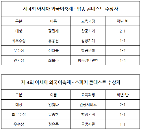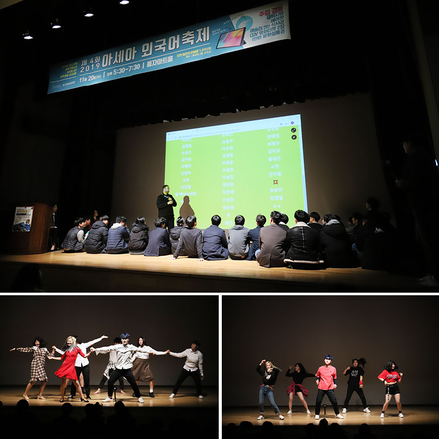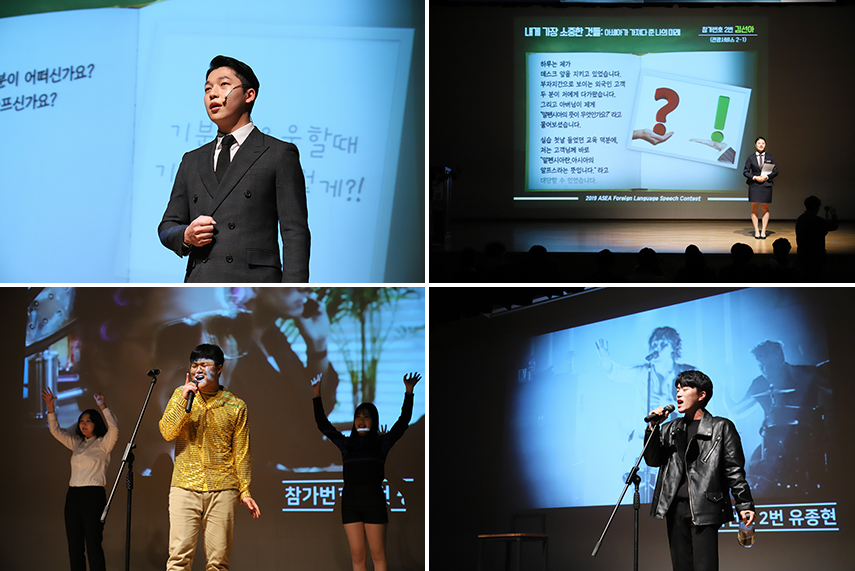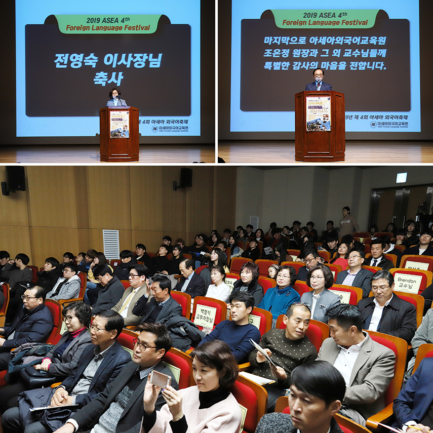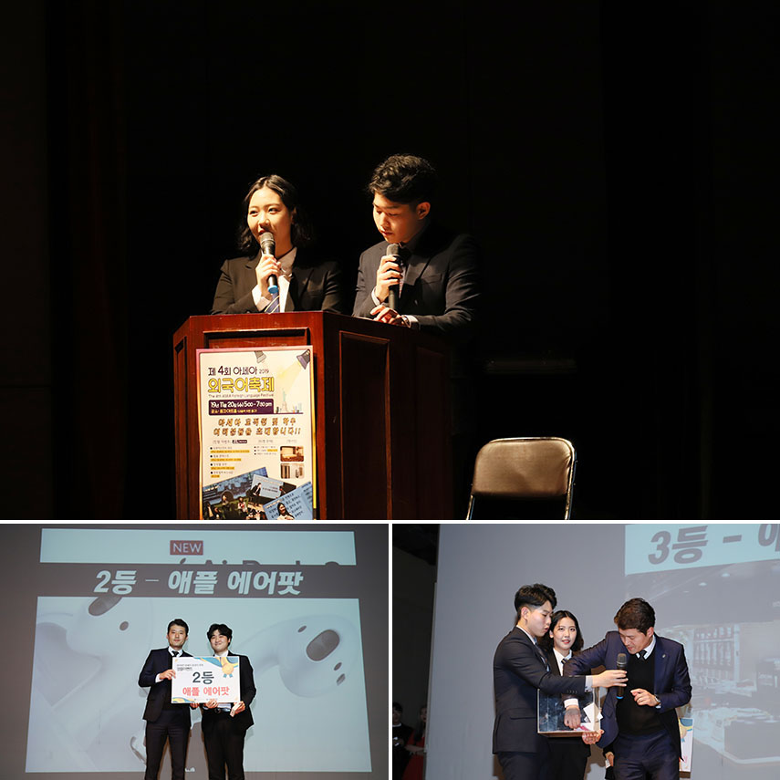 ![]() 2019³â 11¿ù 20ÀÏ ¼ö¿äÀÏ Á¦4ȸ ¾Æ¼¼¾Æ ¿Ü±¹¾î ÃàÁ¦°¡ µ¿ÀÚ¾ÆÆ®È¦¿¡¼ °³ÃÖ µÇ¾ú½À´Ï´Ù. ![]() º»±³ ÀçÇлýµéÀÇ ´Éµ¿ÀûÀÎ ¾ð¾î ´É·Â °³¹ß ¹× ¼¼°è¿ÍÀÇ ¼ÒÅëÀ» À§ÇÑ Àڱ⠹ßÀü µ¿±âÈ ¸ñÀûÀ¸·Î °³ÃÖµÈ À̹ø Çà»ç¿¡ ÀÌ»çÀå´Ô, ÇÐÀå´ÔÀ» Æ÷ÇÔÇÑ ¸¹Àº ³»¿ÜºóÀÌ Âü¼®Çϼż ÀÚ¸®¸¦ ºû³» Áּ̽À´Ï´Ù. º» Çà»ç´Â 1ºÎ¿Í 2ºÎ·Î ³ª´©¾î ÁøÇàµÇ¾ú½À´Ï´Ù. ![]() 1ºÎ Çà»ç´Â Pop Song Contest ¿Í Speech Contest ( NO.1 ~ NO.5)·Î ±¸¼ºµÇ¾î °ü±¤°æ¿µ ±è¼¼Çö, ±¹¹æ»ç°ü Á¤À¯ÁÖ Çп찡 MC¸¦ ¸Ã¾Æ ÁøÇàÇÏ¿´½À´Ï´Ù. ![]() Pop Song Contest¿¡¼´Â 4¸íÀÇ º»¼± ÁøÃâ ÇлýµéÀÇ ±×µ¿¾È ¼û°Ü¿Ô´ø ³ë·¡¿Í Àç´ÉÀ» ¼±º¸¿´À¸¸ç Speech Contest ¿¡¼´Â º»¼± ÁøÃâÀÚ 10¸íÁß 5¸íÀÌ °¢°¢ ³ªÀÇ ¹öŶ¸®½ºÆ®, ³»°Ô °¡Àå ¼ÒÁßÇѰ͵é, ³»»ý¾Ö ÃÖ°íÀÇ ¼ø°£À̶ó´Â ÁÖÁ¦¸¦ ¿µ¾î·Î ¸ÚÁö°Ô ¹ßÇ¥ÇÏ¿© °ü¶÷ÇÑ ¸¹Àº Çпìµé¿¡°Ô ¶ß°Å¿î ¹Ú¼ö¸¦ ¹Þ¾Ò½À´Ï´Ù. ![]() 2ºÎ Çà»ç¿¡¼´Â Speech Contest ( NO.6 ~ NO.10), ¹ÂÁöÄà ÆÛÆ÷¸Õ½º ¹× °ü¶÷ÇÏ´Â Çпìµé°ú ÇÔ²²ÇÏ´Â ÄûÁî À̺¥Æ®, °æÇ°Ãß÷ À̺¥Æ®, ½Ã»ó½ÄÀ¸·Î ±¸¼ºµÇ¾î Ç×°øºÎ»ç°ü ±ÇµµÇü, Å©·çÁî½Â¹«¿ø ÀÌÇϸ° Çп찡 MC¸¦ ¸Ã¾Æ ÁøÇàÇÏ¿´½À´Ï´Ù. ![]() Speech Contest ¿¡¼´Â º»¼± ÁøÃâÀÚ 10¸íÁß ³ª¸ÓÁö 5¸íÀÌ °¢°¢ ³ªÀÇ ¹öŶ¸®½ºÆ®, ³»°Ô °¡Àå ¼ÒÁßÇѰ͵é, 10³âÈÄ ³»°¡ ¾´ Àϱâ, ³»»ý¾Ö ÃÖ°íÀÇ ¼ø°£À̶ó´Â ÁÖÁ¦¸¦ ¿µ¾î, ½ºÆäÀξî, Áß±¹¾î·Î ¸ÚÁö°Ô Ç¥ÇöÇÏ¸ç °¢ÀÚÀÇ ±â·®À» ¸¶À½²¯ ÆîÃÆ½À´Ï´Ù. ![]() ÄûÁî À̺¥Æ®´Â Paul Hershberger ±³¼ö´Ô°ú Á¶ÀºÁ¤ ¿øÀå´Ô²²¼ ÇÔ²² ÁøÇàÇϼÌÀ¸¸ç °ü¶÷ÇÏ´Â Çпìµéµµ Çà»ç¿¡ Âü¿©ÇÒ ¼ö ÀÖ´Â ÁÁÀº ±âȸ°¡ µÇ¾ú½À´Ï´Ù. ƯÈ÷³ª, µüµüÇÑ Çü½ÄÀÇ ÄûÁî°¡ ¾Æ´Ñ ÀçÄ¡ÀÖ°í Àç¹ÌÀÖ´Â ¿µ¾î ÄûÁî·Î ¸¹Àº ÇлýµéÀÇ Âü¿©¿Í È£ÀÀÀ» À̲ø¾î ³ÂÀ¸¸ç, ¹ÂÁöÄà ÆÛÆ÷¸Õ½º¿¡¼´Â ³ë·¡¿Í ÃãÀÌ ÇÔ²²ÇÏ´Â ¼öÁØ ³ôÀº ¹«´ë·Î ¾Æ¼¼¾Æ ÇлýµéÀÇ ³¢¿Í ¿Á¤À» ¿³º¼ ¼ö ÀÖ¾ú½À´Ï´Ù. ![]() À̹ø ´ëȸÀÇ ¿µ±¤ÀÇ ¼ö»óÀÚ´Â ´ÙÀ½°ú °°½À´Ï´Ù. ![]() º» Çà»ç¸¦ À§ÇÏ¿© ¹ã³·, ÁÖ¸» ¾øÀÌ ³Ê¹«³ª ¿½ÉÈ÷ ³ë·ÂÇØ ÁØ ¸ðµç Çлýµé¿¡°Ô ÀÌ ÀÚ¸®¸¦ ºô¾î °¨»çÀÇ ¸»¾¸À» ÀüÇÕ´Ï´Ù. ¾Æ¼¼¾Æ ¿Ü±¹¾î ÃàÁ¦¸¦ ÁغñÇÏ¸é¼ °¥°í ´ÛÀº ¿Ü±¹¾î ½Ç·ÂÀº ¼º°øÀûÀÎ Ãë¾÷ÀÇ Ãʼ®ÀÌ µÉ °ÍÀÔ´Ï´Ù. ¶ÇÇÑ, ¹Ù»Ú½Å ¿ÍÁß¿¡µµ Âü¼®ÇÏ½Ã¾î ¾Æ³¦¾ø´Â ÀÀ¿ø°ú °Ý·Á¸¦ ÇØÁֽг»•¿Üºó ºÐµé²² ´Ù½Ã Çѹø °¨»çÀÇ ¸»¾¸À» µå¸³´Ï´Ù. ![]() ¾ÕÀ¸·Îµµ º»±³ ¹× ¿Ü±¹¾î±³À°¿ø¿¡¼´Â ¼öÁØ ³ôÀº ±³À°°ú ´Ùä·Î¿î ÇÁ·Î±×·¥ µîÀ» ÅëÇØ ÇлýµéÀÇ ¿Ü±¹¾î ½Ç·Â Çâ»óÀ» À§ÇØ ÃÖ¼±À» ´ÙÇÒ °ÍÀÔ´Ï´Ù. ![]() |