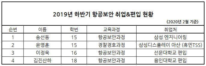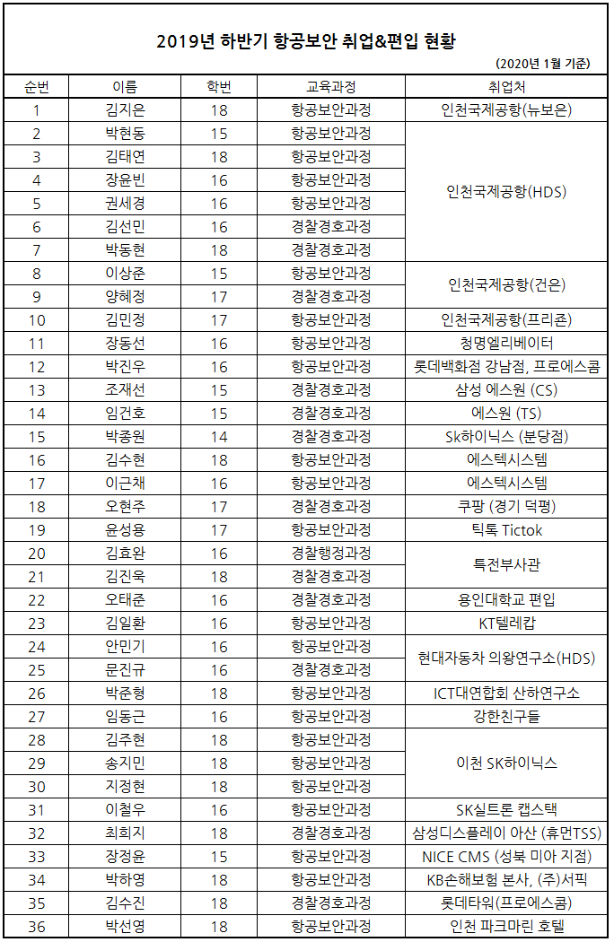 ![]() 2019³â ÇϹݱ⠺»±³ Ç×°øº¸¾È ÇлýµéÀÇ Ãß°¡ Ãë¾÷ÇöȲÀ» °ø°³ÇÕ´Ï´Ù. º»±³ Ç×°øº¸¾È¿¡¼´Â ÀÎõ±¹Á¦°øÇ×°ø»ç¸¦ ºñ·ÔÇÏ¿©, °æÈ£&º¸¾È¾÷ü, ÆíÀÔ µî ´Ù¾çÇÑ ºÐ¾ß·Î ÁøÃâÇÏ¿´À¸¸ç ¸í´ÜÀº ´ÙÀ½°ú °°½À´Ï´Ù. ![]() ![]() ¾Æ¼¼¾ÆÇ×°øÁ÷¾÷Àü¹®Çб³¿¡¼´Â °æÈ£¿ø, °æÂû°ø¹«¿ø, Ç×°øº¸¾È&º¸¾È°Ë»ö¿ä¿ø µî °æÈ£ ¹× º¸¾ÈºÐ¾ßÀÇ Àü¹®°¡ ¾ç¼ºÀ» À§ÇÑ Ã¼°èÀûÀÎ ±³À°°ú ÇÔ²² ½ÇÁ¦ °æÈ£ÇöÀå¿¡¼ °æÈ£½Ç½ÀÀ» ÁøÇàÇÏ´Â µî ½Ç¹«Áß½ÉÀÇ ±³À°À¸·Î ¸Å³â ³ôÀº Ãë¾÷·üÀ» ±â·ÏÇϰí ÀÖ½À´Ï´Ù. ![]() º»±³ Ç×°øº¸¾È ±³¼ö´ÔµéÀÇ ¼öÁØ ³ôÀº ±³À°°ú ÀÀ¿ø, ±×¸®°í Ãë¾÷À» ÇâÇÑ ¿ì¸® Ç×°øº¸¾È ÇлýµéÀÇ ¿Á¤ÀÌ ÀÖ¾ú±â¿¡ À§¿Í°°ÀÌ ÁÁÀº °á°ú¸¦ ¾òÀ» ¼ö ÀÖ¾ú½À´Ï´Ù. º»±³ Ç×°øº¸¾È ÇлýµéÀÇ Ãë¾÷À» Áø½ÉÀ¸·Î ÃàÇϵ帳´Ï´Ù. ![]() |