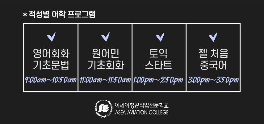 ![]() ¾Æ¼¼¾ÆÇ×°øÁ÷¾÷Àü¹®Çб³ ¿Ü±¹¾î±³À°¿ø¿¡¼´Â 7¿ù 19ÀϺÎÅÍ 22³âµµ ¾Æ¼¼¾Æ ¿¹ºñ ½ÅÀÔ»ýµéÀ» ´ë»óÀ¸·Î ¹«·á ¾îÇÐÆ¯°À» ÁøÇàÇÒ ¿¹Á¤ÀÔ´Ï´Ù. ![]() À̹ø ½ÅÀÔ»ý ¾îÇÐÆ¯°Àº 21³â 7¿ù 19ÀϺÎÅÍ 7¿ù 30ÀϱîÁö ´ë¸é, ºñ´ë¸é È¥ÇÕÀ¸·Î ÁøÇàµÇ¸ç ¿µ¾îÈ¸È ±âÃʹ®¹ý, ¿ø¾î¹Î ±âÃÊȸÈ, ÅäÀÍ ½ºÅ¸Æ®, Á©Ã³À½ Áß±¹¾î ÃÑ 4°¡Áö °ú¸ñ Áß ¼±ÅÃÇÏ¿© ¼ö°ÇÒ ¼ö ÀÖ½À´Ï´Ù. ![]() ¼ö°°ú¸ñÀº 1ÀÎ ÃÖ´ë 3°ú¸ñ±îÁö ¼ö°°¡´ÉÇÕ´Ï´Ù. (´Ü, ¿µ¾îÈ¸È ±âÃʹ®¹ý°ú ÅäÀÍ ½ºÅ¸Æ®´Â µ¿½Ã ¼ö°ºÒ°¡) EX) ¿µ¾îÈ¸È ±âÃʹ®¹ý + ¿ø¾î¹Î ±âÃÊÈ¸È + Á©Ã³À½ Áß±¹¾î, ÅäÀͽºÅ¸Æ® + Á©Ã³À½ Áß±¹¾î + ¿ø¾î¹Î ±âÃÊÈ¸È ![]() ¾Æ¼¼¾ÆÀÇ ¹Ì·¡¸¦ Ã¥ÀÓÁú ¿¹ºñ ½ÅÀÔ»ýµéÀÌ À̹ø ¾îÇÐÆ¯°À¸·Î ¾îÇÐ °æÀï·Â °È ¹× Çб³»ýȰ ÀûÀÀ¿¡ µµ¿òÀÌ µÇ±æ ¹Ù¶ø´Ï´Ù. ¾Æ¿ï·¯, Àڱ⠰³¹ßÀ» À§ÇÑ ¶ß°Å¿î ¿Á¤À» Áö´Ñ ¿¹ºñ ½ÅÀÔ»ýµé¿¡°Ô Àû±ØÀûÀÎ ÁöÁö¿Í °Ý·Á¸¦ º¸³À´Ï´Ù. ![]() |