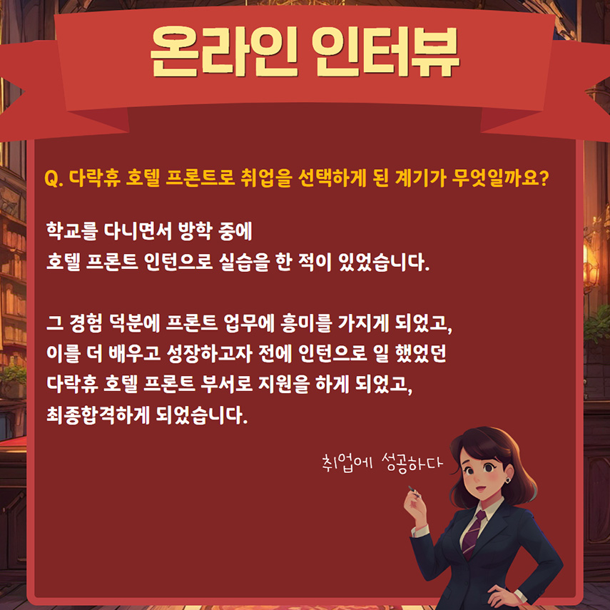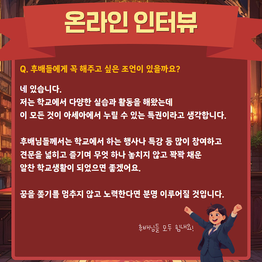 ![]() 2024³â ÇϹݱâ Ç×°ø°ü±¤°è¿¿¡¼´Â ´Ù¶ôÈÞ È£ÅÚ ÇÁ·ÐÆ®¿¡ ÃÖÁ¾ÇÕ°ÝÇÑ ÇлýÀÌ µîÀåÇß½À´Ï´Ù. ![]() ¿À´ÃÀÇ ÁÖÀΰøÀº Ç×°ø°ü±¤°è¿ ³ª¼º·É ÀçÇлýÀ¸·Î 2024³âÀ» ³¡À¸·Î Çб³¸¦ Á¹¾÷ÇÏ´Â Á¹¾÷ ¿¹Á¤ÀÚÀÔ´Ï´Ù. ![]() ³ª¼º·É ÀçÇлýÀº º»±³¸¦ ´Ù´Ï¸ç Ç×°ø°ü±¤°è¿¿¡¼ ÃßÁøÇÑ È£ÅÚ ÇÁ·ÐÆ® ÀÎÅÏ ½Ç½ÀÀ» ÁøÇàÇØº» ÀûÀÌ ÀÖ¾ú°í ±× ÀÎÅÏ È°µ¿À» ÅëÇØ È£ÅÚ ÇÁ·ÐÆ® ¾÷¹«¿¡ Èï¹Ì¸¦ ´À²¸ ¹Ì·¡¸¦ ²Þ ²Ù°Ô µÇ¾ú´Ù°í ¹àÇû½À´Ï´Ù. ![]() À̹ø Ãë¾÷ ÀÎÅͺ並 ÅëÇØ Çб³¿¡¼ Ãë¾÷À» À§ÇÑ ´Ù¾çÇÑ ½Ç½À°ú üÇè Ȱµ¿ µîÀÌ º»±³¿¡¼ ´©¸± ¼ö Àִ Ư±ÇÀ̶ó°í »ý°¢ÇÑ´Ù¸ç ¸¹Àº ÈĹèµéÀÌ Çà»ç³ª Ư° ¸¹Àº üÇèÀ» ÅëÇØ °ß¹®À» ³ÐÈ÷°í ¾ËÂù Çб³»ýȰÀ» ÇÏ±æ ¹Ù¶õ´Ù°í Á¶¾ðÀ» ÁÖ¾ú½À´Ï´Ù. ²ÞÀ» ÀÌ·ç°Ô µÈ ÀçÇлý¿¡°Ô ÃàÇϸ¦ º¸³»¸ç ¾Æ¼¼¾Æ´Â ÀçÇлýµéÀÇ ¾ÕÀ¸·ÎÀÇ ¿©Á¤µµ ÀÀ¿øÇϰڽÀ´Ï´Ù! ![]() |